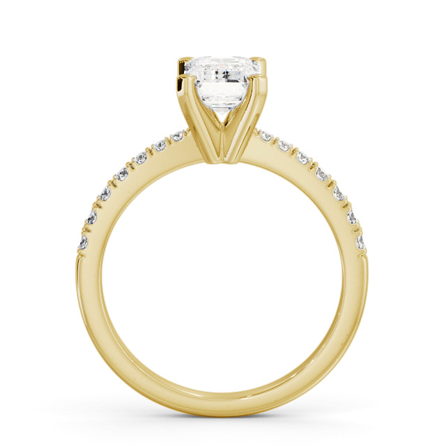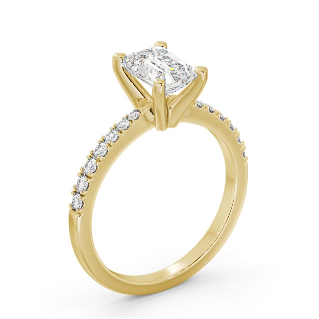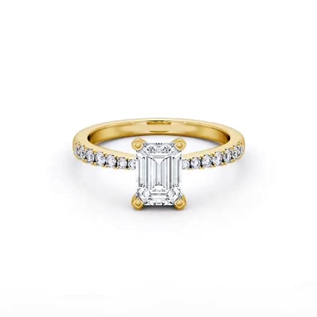 Charis diamond engagement ring with a four claw 9K Yellow Gold setting. Absolute unique and appealing, this ring exhibits an emerald shaped centre diamond peacefully sitting above a round diamond studded tapered band. Total diamond side stones weigh approximately 0.18ct with Clarity VS1 and Colour F. This ring is available in a range of metal options and your choice of natural or lab grown diamonds. We offer a free design service for any customised changes that you may require.