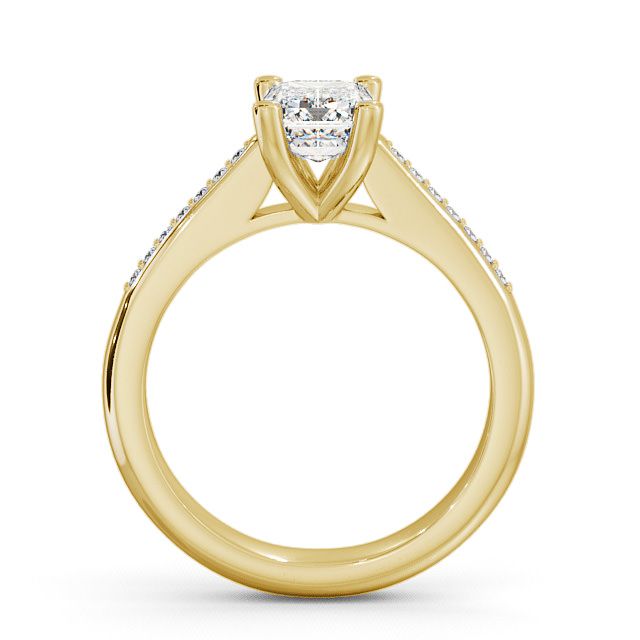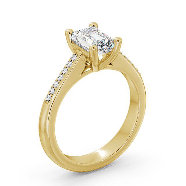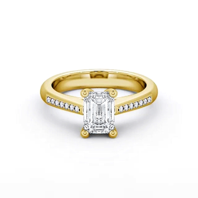 Chelsie diamond engagement ring with a four claw 9K Yellow Gold setting. A magnificent engagement ring with an emerald shaped centre diamond adorned by a delicate round diamonds on both sides of the shoulder. The diamond side stones are an approximate total of 0.08ct with Clarity VS1 and Colour F. This ring is available in a range of metal options and your choice of natural or lab grown diamonds. We offer a free design service for any customised changes that you may require.