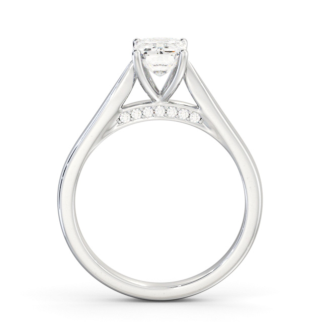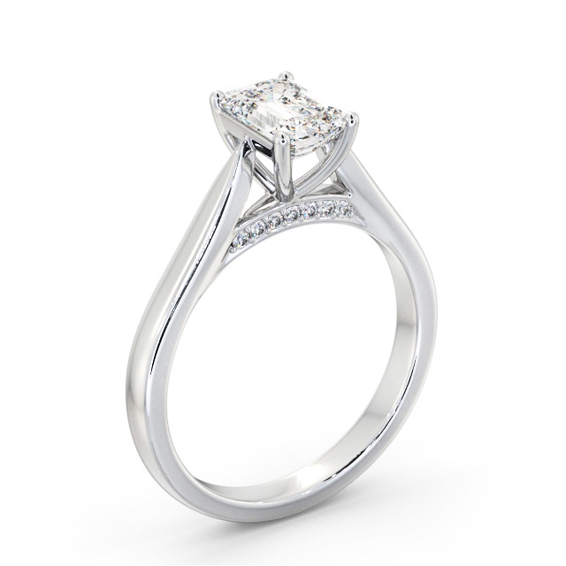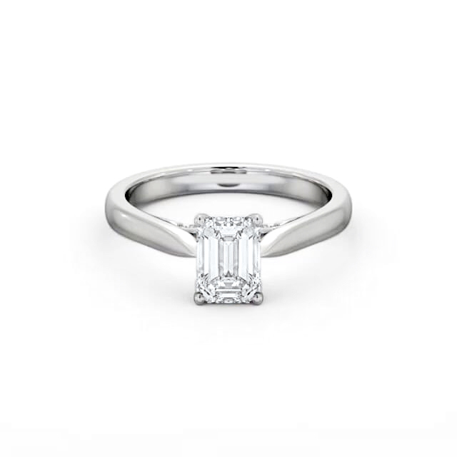 Wandel diamond engagement ring with a four claw Palladium setting. With refined elegance this ring showcases a sparkling emerald shaped diamond standing tall in a four prong setting, and additional round diamonds line the ring's bridge. This ring is available in a range of metal options and your choice of natural or lab grown diamonds. We offer a free design service for any customised changes that you may require.