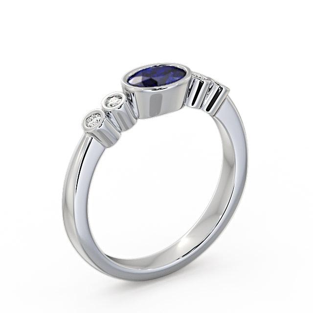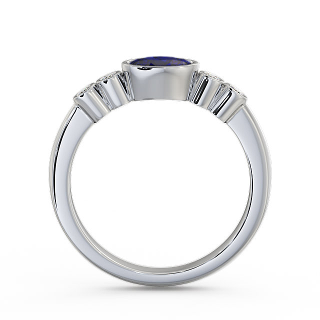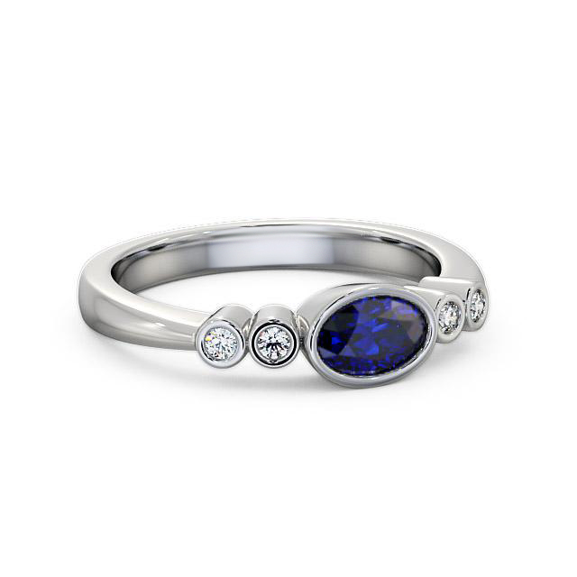 Somaya five stone blue sapphire and diamond 0.66ct ring in a 18K White Gold setting. A beautiful gemstone and diamond ring with a unique design. At the centre is a 0.60 Carat oval-cut blue sapphire bezel set and two round diamonds at each side with a 0.06 Carat total weight. This ring is available in a range of metal options with AAA grade gemstone. We offer a free design service for any customised changes that you may require.