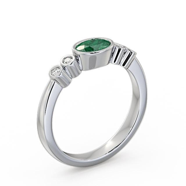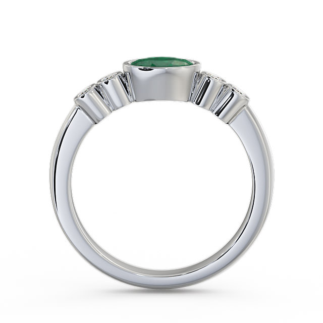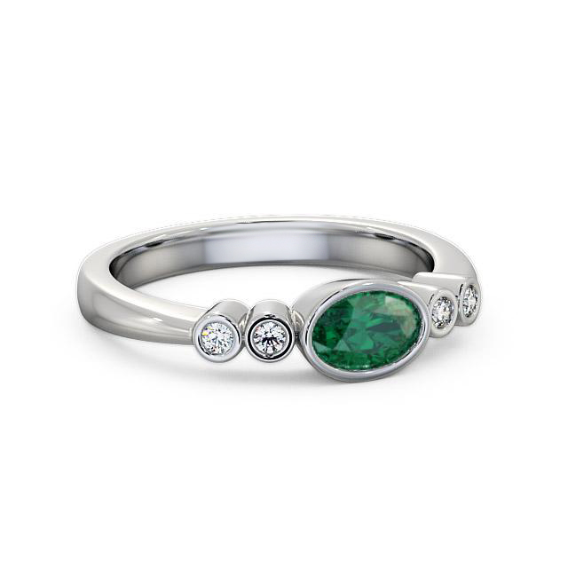 Somaya five stone emerald and diamond 0.58ct ring in a 18K White Gold setting. A beautiful gemstone and diamond ring with a unique design. At the centre is a 0.52 Carat oval-cut emerald bezel set and two round diamonds at each side with a 0.06 Carat total weight. This ring is available in a range of metal options with AAA grade gemstone. We offer a free design service for any customised changes that you may require.