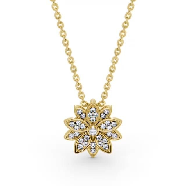 Beverly floral shaped diamond pendant in 9K Yellow Gold. Nested in glory and sophistication, this flower design pendant displays ten diamond embedded petals, flanking the centre round diamond. This pendant is available in a range of metal and chain options with your choice of natural or lab grown diamonds. We offer a free design service for any customised changes that you may require.