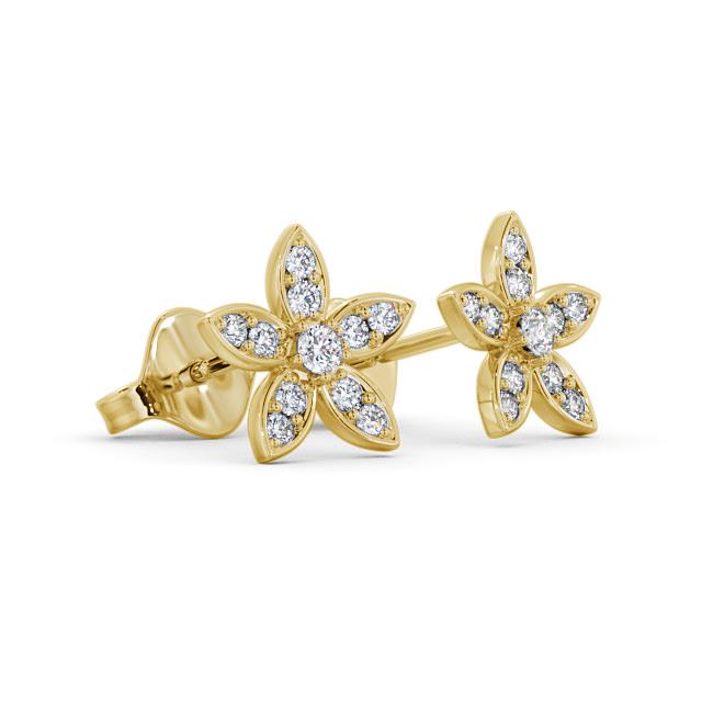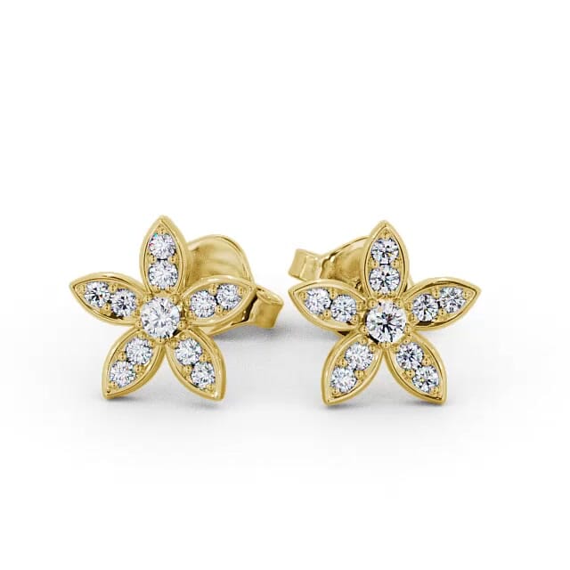 Loretta cluster diamond earrings in 18K Yellow Gold. With exceptional allure, these nature-inspired floral earrings feature five petals, embedded with shimmering round diamonds. The total diamond weight is based on per pair. These earrings are available in a range of metal options and your choice of natural or lab grown diamonds. We offer a free design service for any customised changes that you may require.