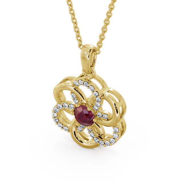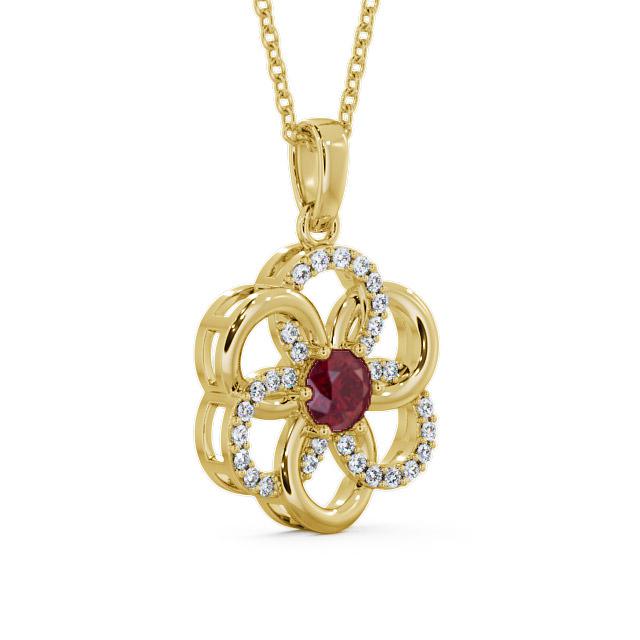 Kelsi floral design ruby and diamond 0.91ct pendant in a 9K Yellow Gold setting. This floral design pendant features a single 0.65 Carat round shaped ruby gemstone in the centre, haloed by 0.26 Carat total weight of round diamond studded petals. The pendant is available in a range of metal and chain options with AAA grade gemstones. We offer a free design service for any customised changes that you may require.