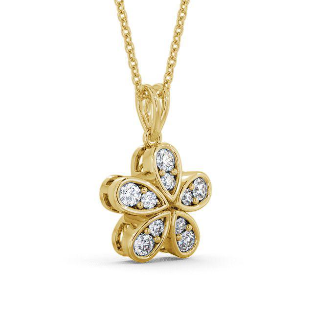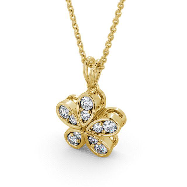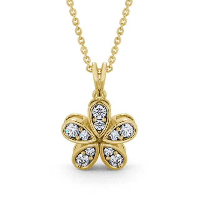 Kerrington flower shaped diamond pendant in 18K Yellow Gold. Floral and sweet, this pendant depicts five pear shaped petals studded with dazzling round diamonds. This pendant is available in a range of metal and chain options with your choice of natural or lab grown diamonds. We offer a free design service for any customised changes that you may require.