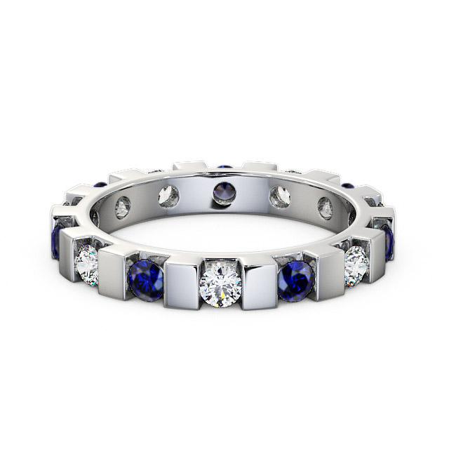 Anila full eternity blue sapphire and diamond 1.05ct ring in a Palladium setting. An alluring eternity design, this elegant ring is bar set with alternate 0.63 Carat round blue sapphires and sparkling round diamonds totalling to 0.42 Carat. This ring is available in a range of metal options with AAA grade gemstone. We offer a free design service for any customised changes that you may require.