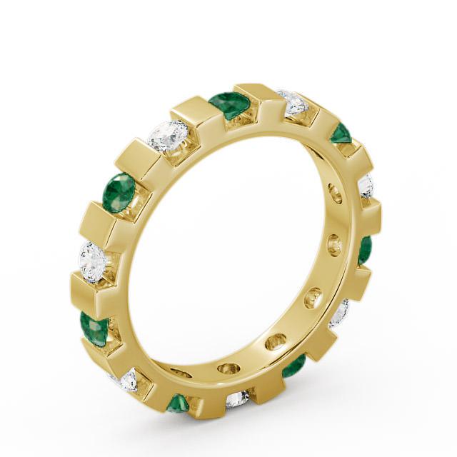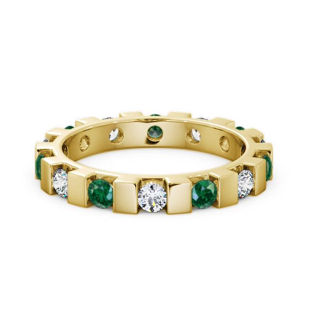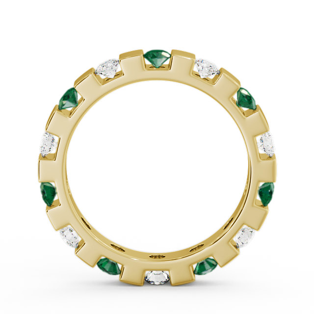 Anila full eternity emerald and diamond 0.91ct ring in a 18K Yellow Gold setting. An alluring eternity design, this elegant ring is bar set with alternate 0.49 Carat round emeralds and sparkling round diamonds totalling to 0.42 Carat. This ring is available in a range of metal options with AAA grade gemstone. We offer a free design service for any customised changes that you may require.