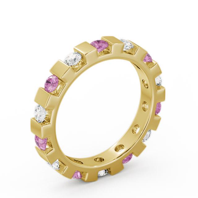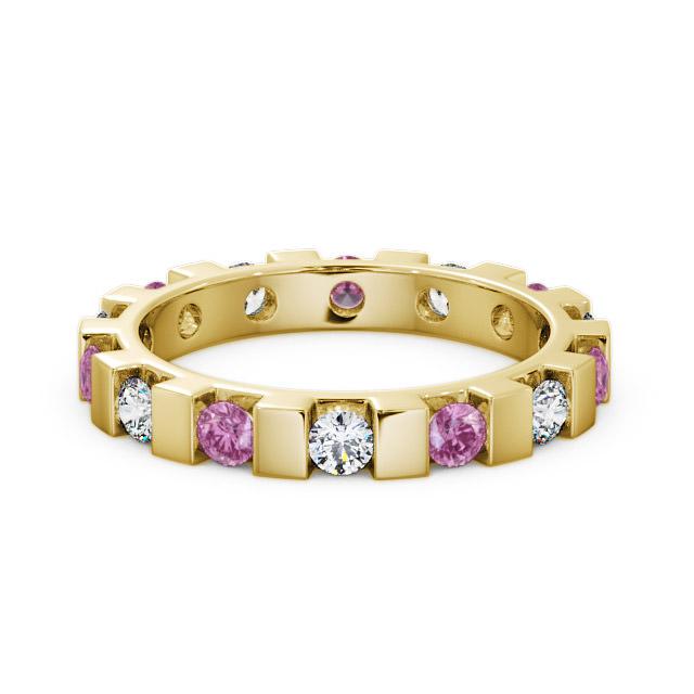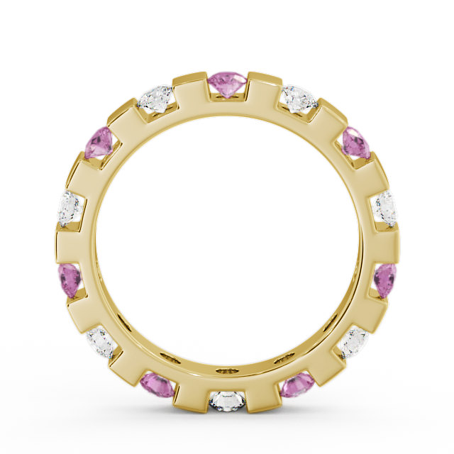 Anila full eternity pink sapphire and diamond 1.05ct ring in a 18K Yellow Gold setting. An alluring eternity design, this elegant ring is bar set with alternate 0.63 Carat round pink sapphires and sparkling round diamonds totalling to 0.42 Carat. This ring is available in a range of metal options with AAA grade gemstone. We offer a free design service for any customised changes that you may require.