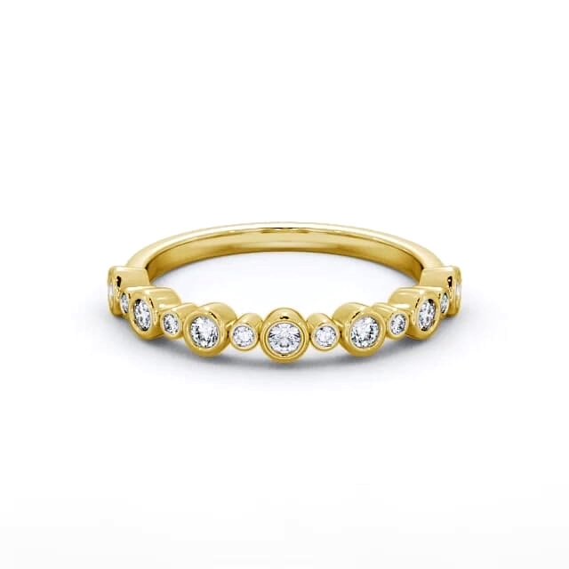 Miliana half eternity diamond ring in a bezel 18K Yellow Gold setting. As elegant as it is unique, this half eternity ring features alternating sizes of shimmering round diamonds bezel set in a delightful rhythmic pattern. This ring is available in a range of metal options and your choice of natural or lab grown diamonds. We offer a free design service for any customised changes that you may require.