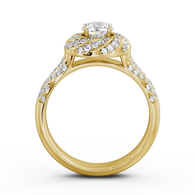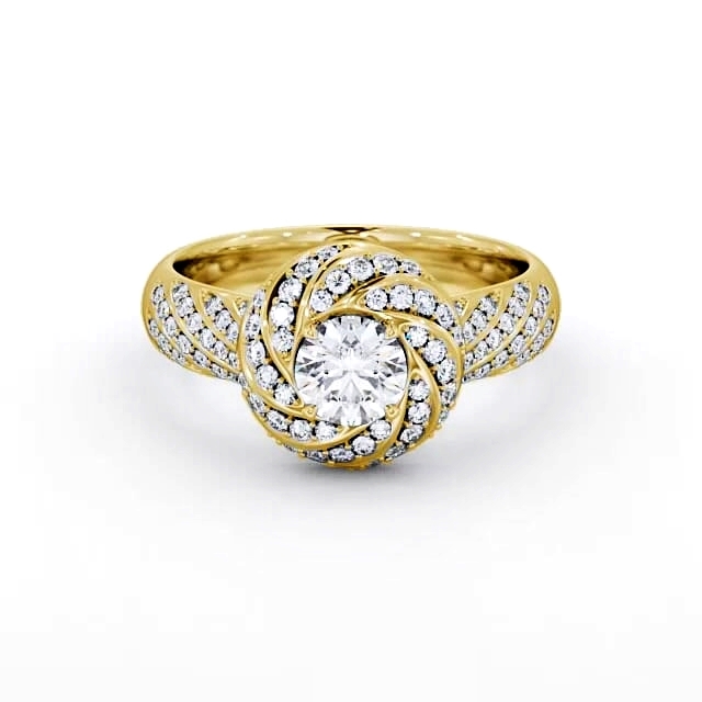 Luka diamond engagement ring with a halo 18K Yellow Gold setting. Distinctive and beautiful, this engagement ring boasts a single round diamond in the centre haloed by small round diamonds studded swirl design. Additional round diamonds are diagonally placed on both of the shoulders. Smaller diamonds will be of VS1 Clarity and F Colour as standard. This ring is available in a range of metal options and your choice of natural or lab grown diamonds. We offer a free design service for any customised changes that you may require.