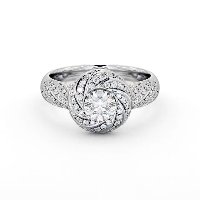 Luka diamond engagement ring with a halo 9K White Gold setting. Distinctive and beautiful, this engagement ring boasts a single round diamond in the centre haloed by small round diamonds studded swirl design. Additional round diamonds are diagonally placed on both of the shoulders. Smaller diamonds will be of VS1 Clarity and F Colour as standard. This ring is available in a range of metal options and your choice of natural or lab grown diamonds. We offer a free design service for any customised changes that you may require.