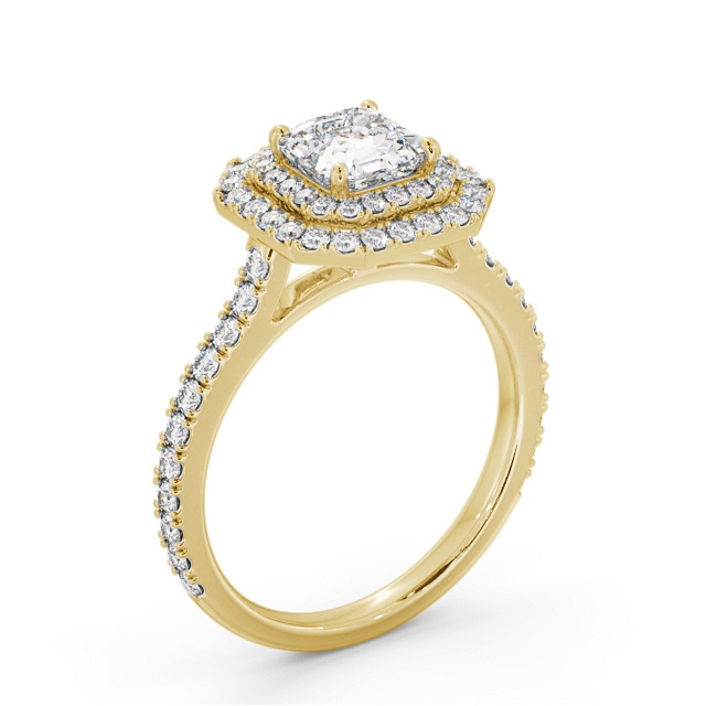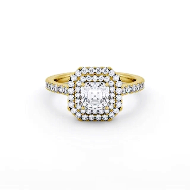 Lennix diamond engagement ring with a halo 9K Yellow Gold setting. This impressive engagement ring features an opulent asscher shaped centre diamond resting within a mesmerising double halo of round diamonds that flows down each side of the shoulder. Smaller diamonds will be of VS1 Clarity and F Colour as standard. This ring is available in a range of metal options and your choice of natural or lab grown diamonds. We offer a free design service for any customised changes that you may require.