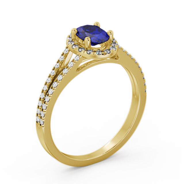 Jailah halo blue sapphire and diamond 0.86ct ring in a 18K Yellow Gold setting. Classic and impressive, this gorgeous ring showcases a single 0.60 Carat oval-cut blue sapphire in the centre, along with sparkling 0.26 Carat total weight of round diamonds on the halo and each split design shoulder. This ring is available in a range of metal options with AAA grade gemstone. We offer a free design service for any customised changes that you may require.