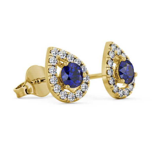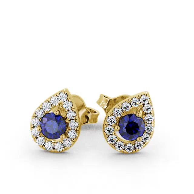 Brexley halo blue sapphire and diamond 0.96ct earrings in a 18K Yellow Gold setting. These spectacular stud earrings showcases ravishing 0.68 Carat total weight round blue sapphire gemstones, framed by a pear-shaped halo of shimmering 0.28 Carat total weight of round diamonds. The total Carat weight is based on per pair. These earrings are available in a range of metal options with AAA grade gemstone. We offer a free design service for any customised changes that you may require.