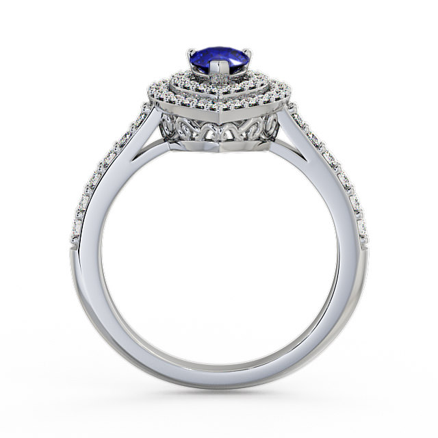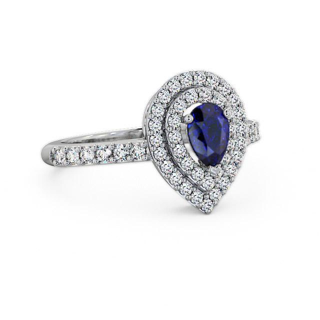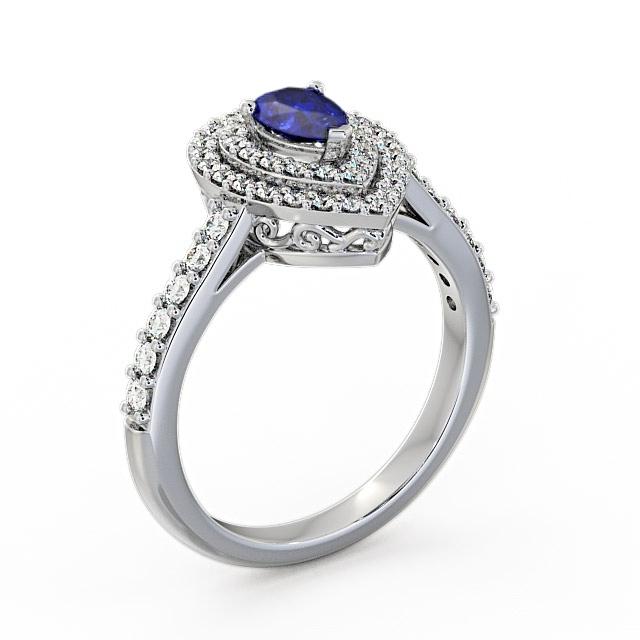 Tracy halo blue sapphire and diamond 0.97ct ring in a 9K White Gold setting. This delightful ring features a beautiful 0.50 Carat pear shaped blue sapphire in the centre framed by 0.47 Carat total weight of round diamonds on a double halo and down each shoulders. This ring is available in a range of metal options with AAA grade gemstone. We offer a free design service for any customised changes that you may require.