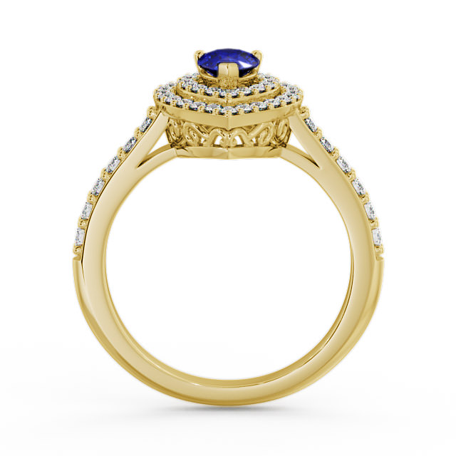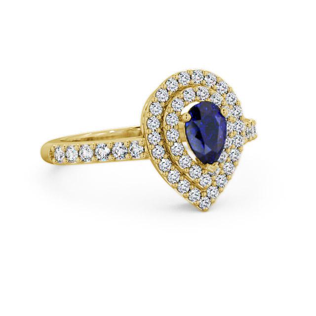 Tracy halo blue sapphire and diamond 0.97ct ring in a 9K Yellow Gold setting. This delightful ring features a beautiful 0.50 Carat pear shaped blue sapphire in the centre framed by 0.47 Carat total weight of round diamonds on a double halo and down each shoulders. This ring is available in a range of metal options with AAA grade gemstone. We offer a free design service for any customised changes that you may require.
