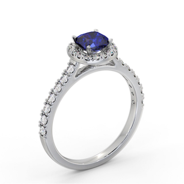 Laven halo blue sapphire and diamond 1.20ct ring in 18K White Gold. A solitary 0.75ct Cushion shaped blue sapphire is surrounded by a cluster of small round shaped diamonds that extend down either side of the band for a total diamond weight of 0.45ct in this traditional and beautiful style ring. This ring is available in a variety of metal types and your choice of natural or lab grown gems. We provide a free design service for any special modifications that you may require.