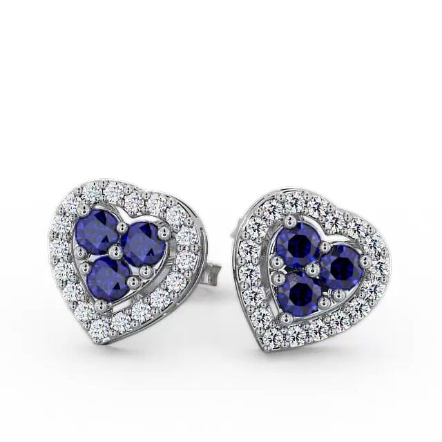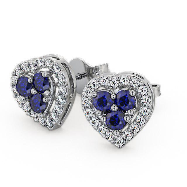 Esabella halo blue sapphire and diamond 1.26ct earrings in a 18K White Gold setting. Romantic and full of sparkle, each of these heart earring features three round blue sapphire gemstones at the centre, majestically hugged by sparkling round diamonds. Sapphires weighs 0.90 Carat total weight and diamonds weighs 0.36 Carat total weight. The total Carat weight is based on per pair. These earrings are available in a range of metal options with AAA grade gemstone. We offer a free design service for any customised changes that you may require.