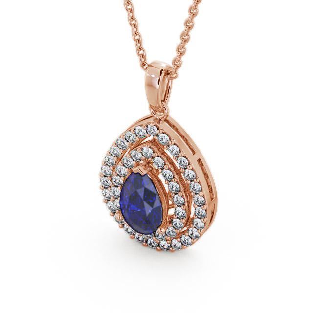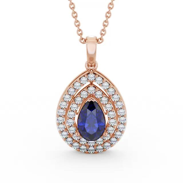 Harriet halo blue sapphire and diamond 1.44ct pendant in a 18K Rose Gold setting. Elegant and exquisite, this pendant features a 1.00 Carat pear shaped blue sapphire covered in a double halo of sparkling 0.44 Carat total weight of round diamonds. The pendant is available in a range of metal and chain options with AAA grade gemstone. We offer a free design service for any customised changes that you may require.