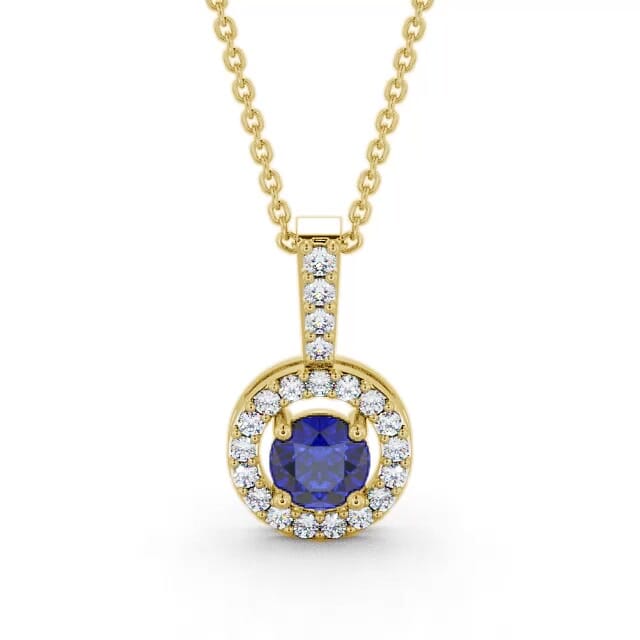 Kyrie halo blue sapphire and diamond 1.50ct pendant in a 18K Yellow Gold setting. Simple and elegant, this exquisite pendant depicts a 1.05 Carat round blue sapphire gemstone in the centre illuminated by a charming halo of round diamonds. Additional diamond-lined bail provides extra shine. Total diamonds weighs 0.45 Carat. The pendant is available in a range of metal and chain options with AAA grade gemstone. We offer a free design service for any customised changes that you may require.