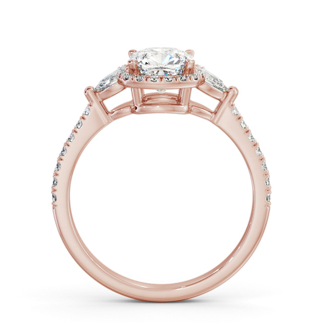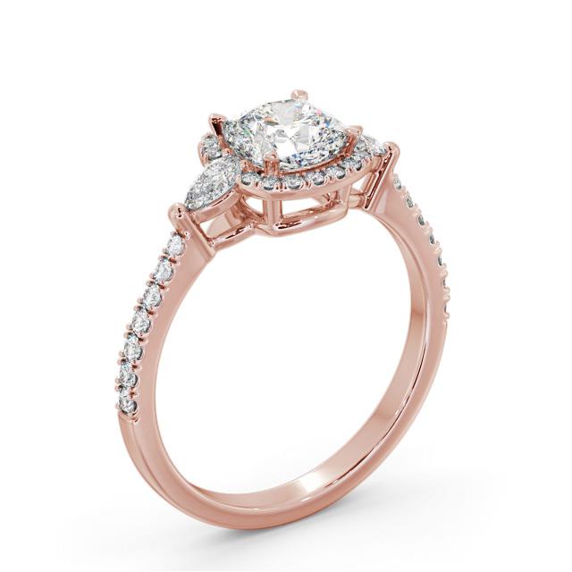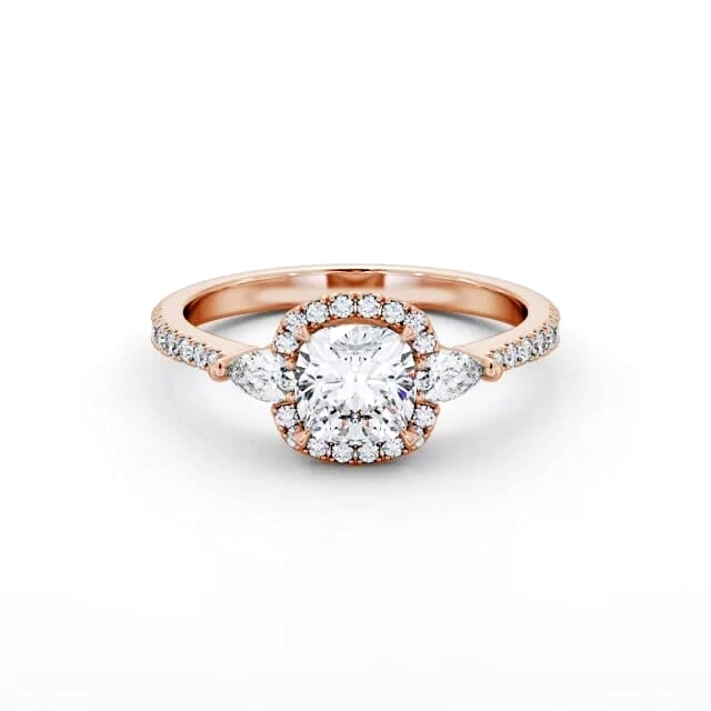 Gabriella diamond engagement ring with a halo 18K Rose Gold setting. An elegant creation, a remarkable cushion shaped diamond rests inside a halo of round diamonds while two pear shaped side diamonds and small round diamonds line the sleek band to complete the contemporary appeal of this lovely ring. Smaller diamonds will be of VS1 Clarity and F Colour as standard. This ring is available in a range of metal options and your choice of natural or lab grown diamonds. We offer a free design service for any customised changes that you may require.