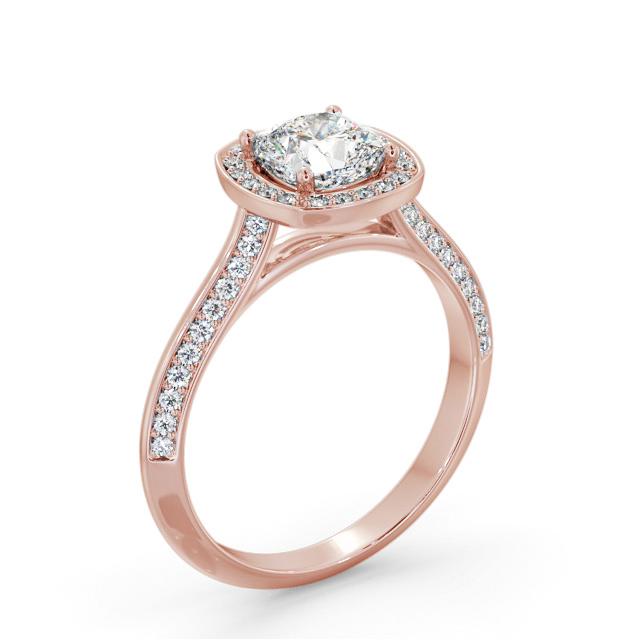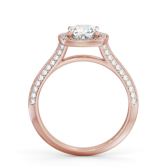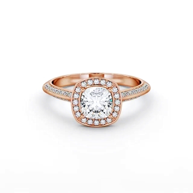 Rayna diamond engagement ring with a halo 18K Rose Gold setting. Stunning and timeless, a cushion shaped centre diamond prong set inside a halo of small round diamonds draws effortless attention. More round diamonds on each side of the knife edge band completes the brilliance of this breathtaking ring. Smaller diamonds will be of VS1 Clarity and F Colour as standard. This ring is available in a range of metal options and your choice of natural or lab grown diamonds. We offer a free design service for any customised changes that you may require.