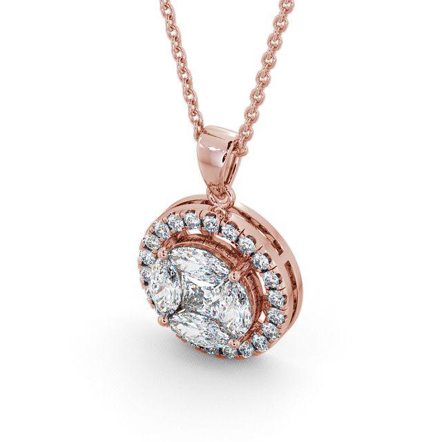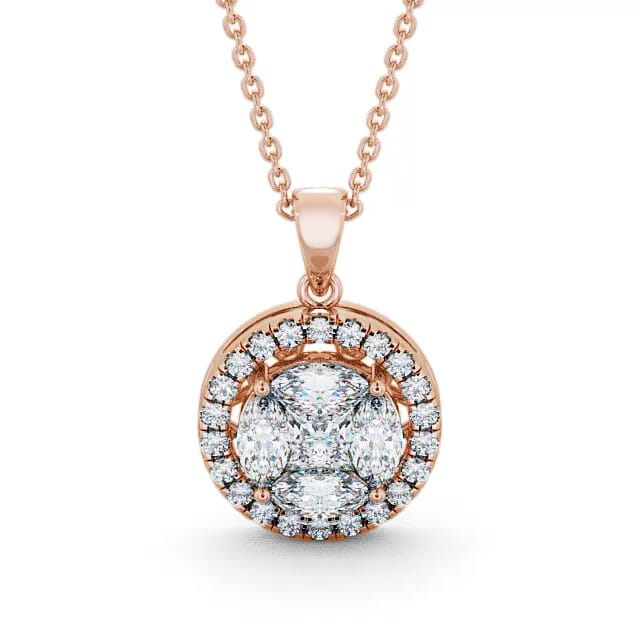 Kemora halo diamond pendant in 9K Rose Gold. Sparkling and trendy, this circle pendant exhibits four marquise and one square shaped diamonds studded centre cluster, haloed by small round diamonds. Smaller round diamonds will be of standard quality VS1 Clarity and F Colour. This pendant is available in a range of metal and chain options with your choice of natural or lab grown diamonds. We offer a free design service for any customised changes that you may require.