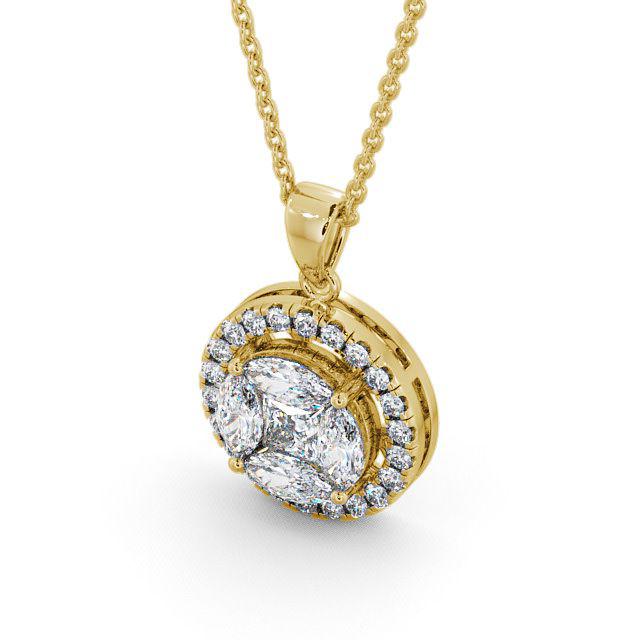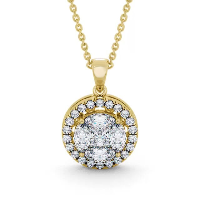 Kemora halo diamond pendant in 9K Yellow Gold. Sparkling and trendy, this circle pendant exhibits four marquise and one square shaped diamonds studded centre cluster, haloed by small round diamonds. Smaller round diamonds will be of standard quality VS1 Clarity and F Colour. This pendant is available in a range of metal and chain options with your choice of natural or lab grown diamonds. We offer a free design service for any customised changes that you may require.