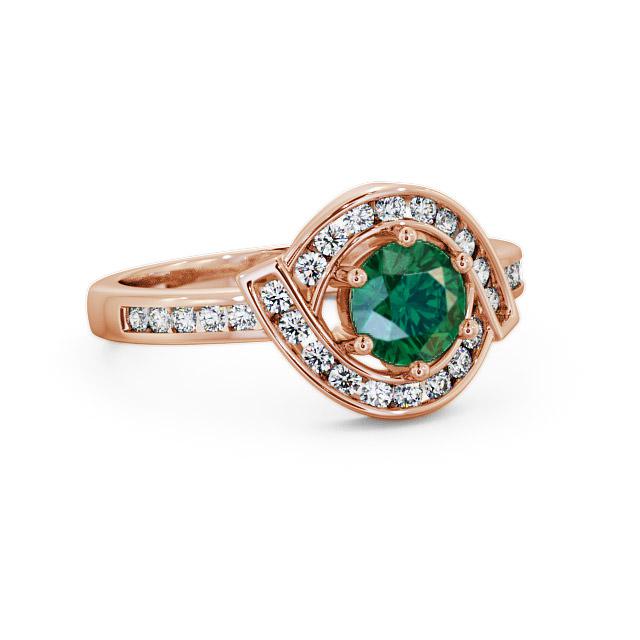 Lenna halo emerald and diamond 0.74ct ring in a 9K Rose Gold setting. This designer ring boasts a stunning 0.48 Carat round emerald gemstone in the centre encircled by channel set sparkling round diamonds. Additional round diamonds flow down on either side of the shank, total diamonds weighs 0.26 Carat. This ring is available in a range of metal options with AAA grade gemstone. We offer a free design service for any customised changes that you may require.