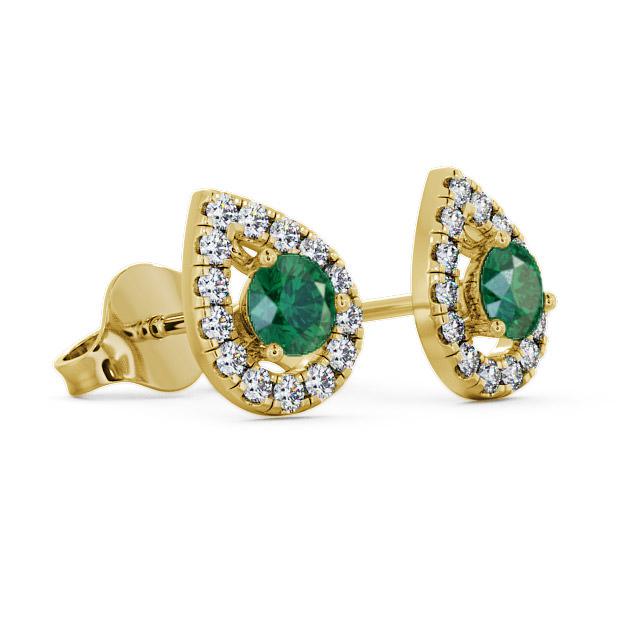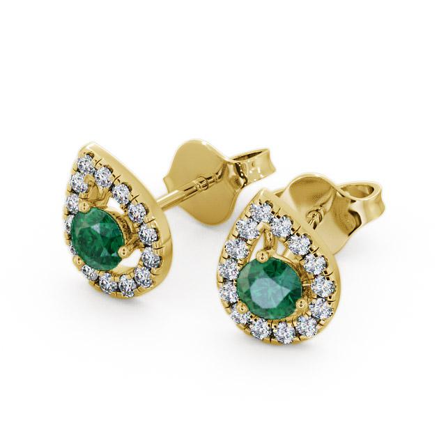 Brexley halo emerald and diamond 0.82ct earrings in a 18K Yellow Gold setting. These spectacular stud earrings showcases ravishing 0.54 Carat total weight round emerald gemstones, framed by a pear-shaped halo of shimmering 0.28 Carat total weight of round diamonds. The total Carat weight is based on per pair. These earrings are available in a range of metal options with AAA grade gemstone. We offer a free design service for any customised changes that you may require.