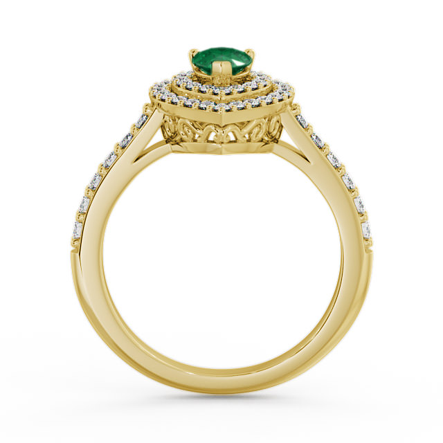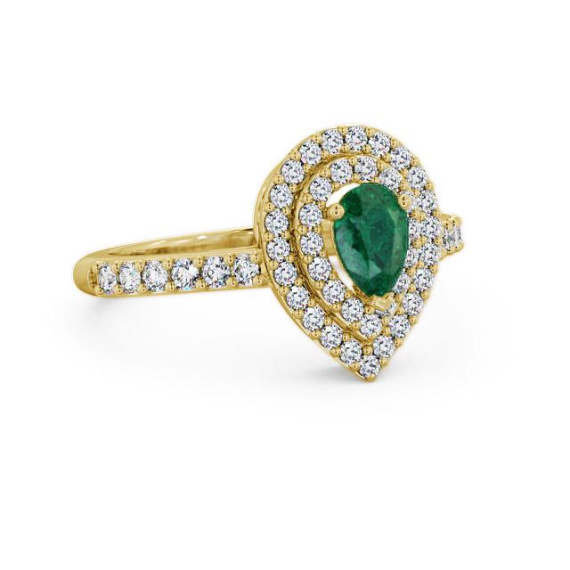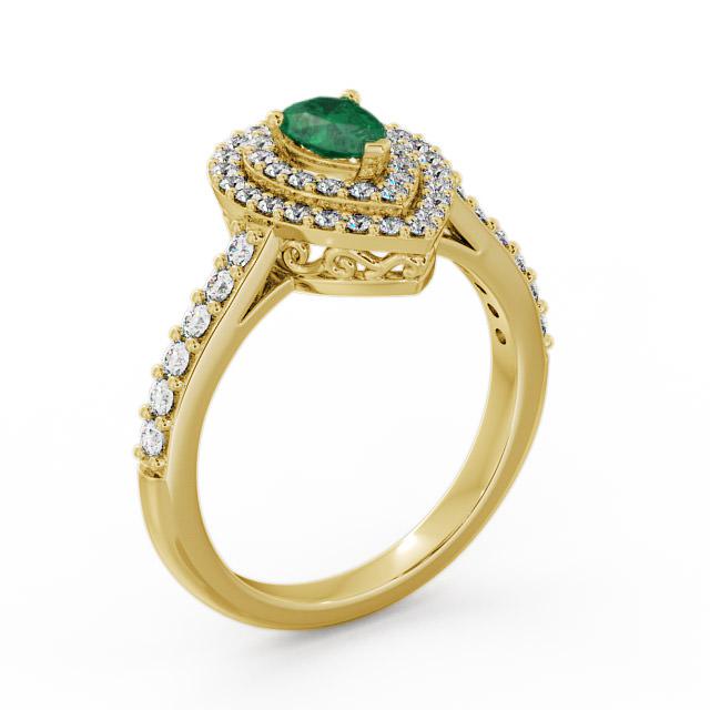 Tracy halo emerald and diamond 0.92ct ring in a 18K Yellow Gold setting. This delightful ring features a beautiful 0.45 Carat pear shaped emerald in the centre framed by 0.47 Carat total weight of round diamonds on a double halo and down each shoulders. This ring is available in a range of metal options with AAA grade gemstone. We offer a free design service for any customised changes that you may require.