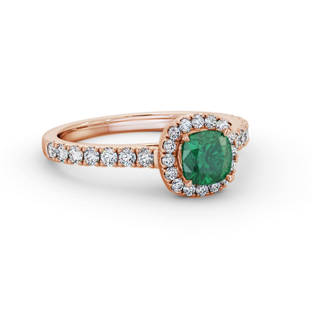 Laven halo emerald and diamond 1.05ct ring in 9K Rose Gold. A solitary 0.60ct Cushion shaped emerald is surrounded by a cluster of small round shaped diamonds that extend down either side of the band for a total diamond weight of 0.45ct in this traditional and beautiful style ring. This ring is available in a variety of metal types and your choice of natural or lab grown gems. We provide a free design service for any special modifications that you may require.