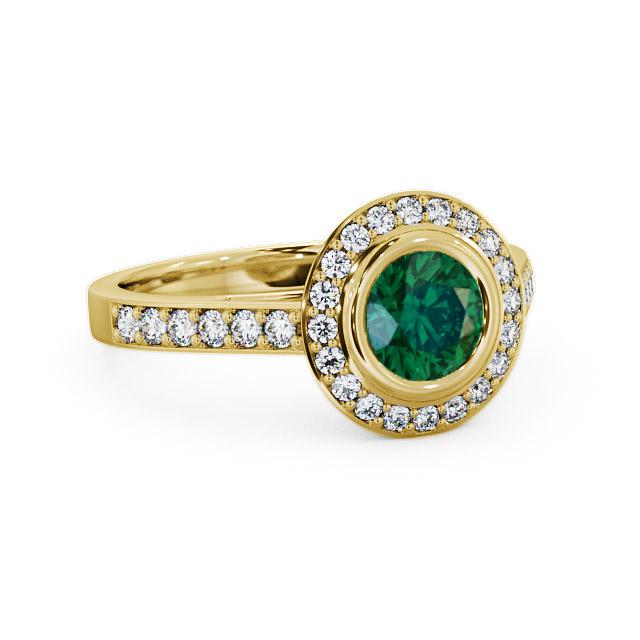 Jaelle halo emerald and diamond 1.11ct ring in a 18K Yellow Gold setting. Sophisticated and incomparable, a 0.80 Carat round shaped emerald centre gemstone is surrounded by a halo of dazzling round diamonds that continue down the delicate shank with a 0.31 Carat total weight. This ring is available in a range of metal options with AAA grade gemstone. We offer a free design service for any customised changes that you may require.