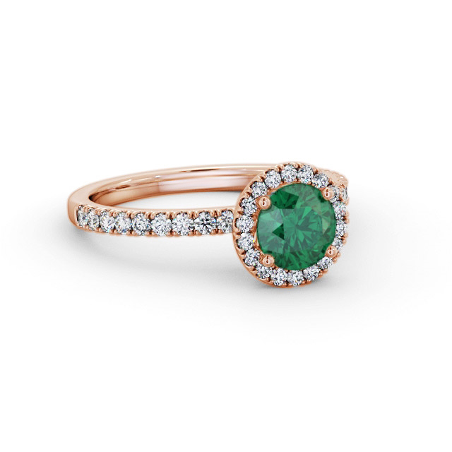 Acali halo emerald and diamond 1.20ct ring in 9K Rose Gold. A single 0.80ct round shaped emerald is surrounded by a cluster of small round shaped diamonds that continue down each side of the band for a total diamond weight of 0.40ct in this contemporary and sleek design ring. This ring is available in a variety of metal types and your choice of natural or lab grown gems. We provide a free design service for any special modifications that you may require.