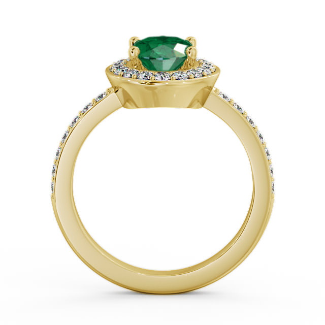 Juliette halo emerald and diamond 1.74ct ring in a 9K Yellow Gold setting. Amazingly detailed, the eye-catching oval shaped emerald central gemstone is framed by round diamonds which also extend down the band to give eternal shimmer. Gemstone weighs 1.26 Carat and total diamonds weighs 0.48 Carat. This ring is available in a range of metal options with AAA grade gemstone. We offer a free design service for any customised changes that you may require.
