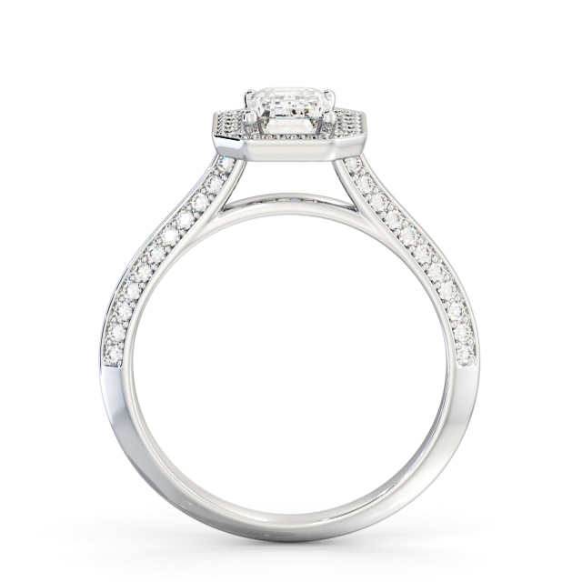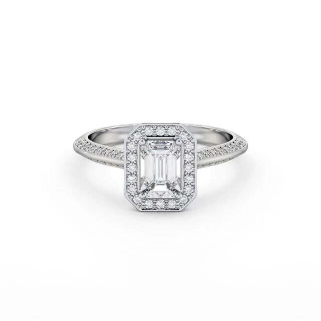 Grayson diamond engagement ring with a halo 18K White Gold setting. An emerald shaped centre diamond dazzles with a halo of small round diamonds, and a double row of additional round diamonds stud each side of the knife edge style band. Smaller diamonds will be of VS1 Clarity and F Colour as standard. This ring is available in a range of metal options and your choice of natural or lab grown diamonds. We offer a free design service for any customised changes that you may require.