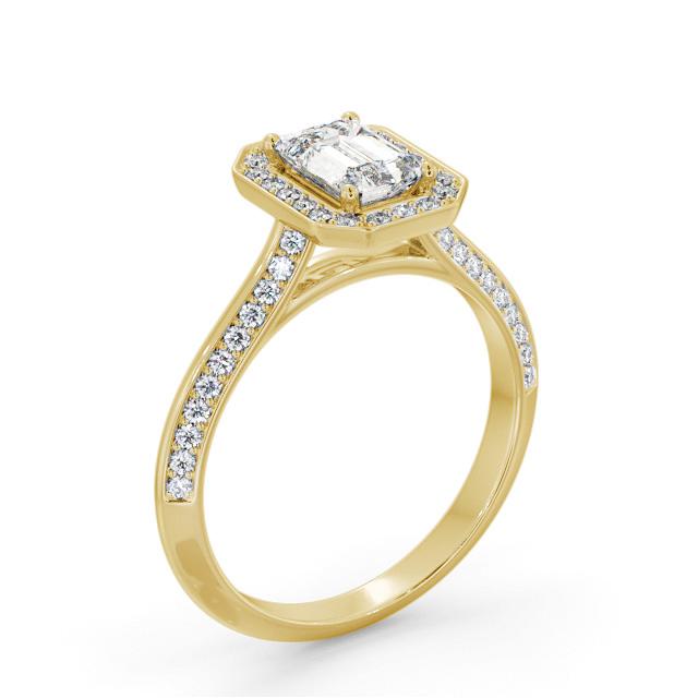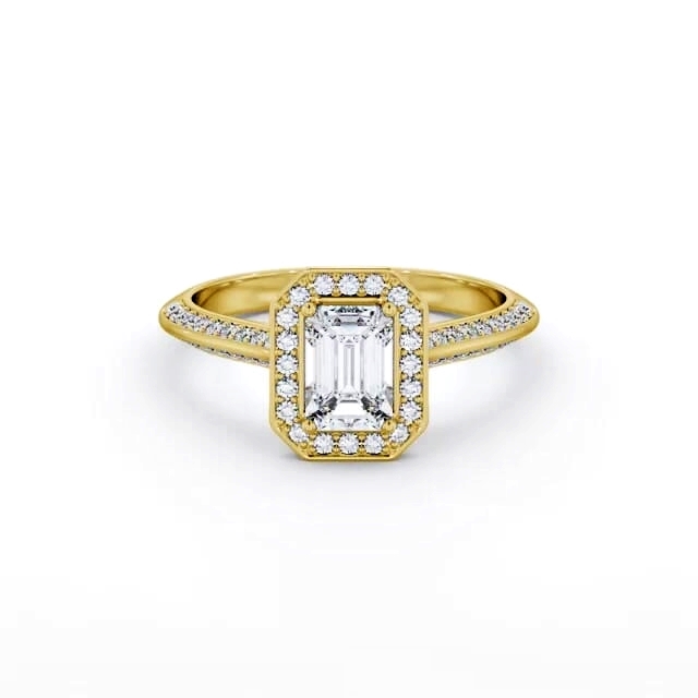 Grayson diamond engagement ring with a halo 18K Yellow Gold setting. An emerald shaped centre diamond dazzles with a halo of small round diamonds, and a double row of additional round diamonds stud each side of the knife edge style band. Smaller diamonds will be of VS1 Clarity and F Colour as standard. This ring is available in a range of metal options and your choice of natural or lab grown diamonds. We offer a free design service for any customised changes that you may require.