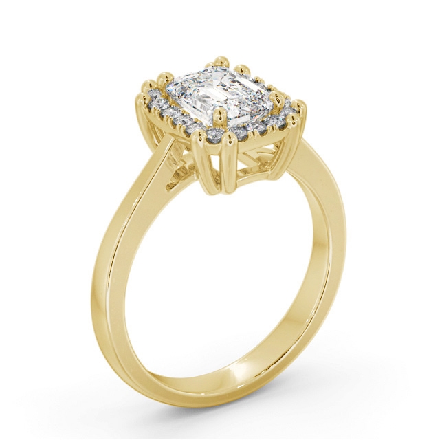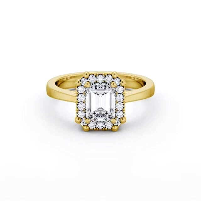 Yasmin diamond engagement ring with a halo 18K Yellow Gold setting. An emerald shaped centre diamond is set atop this classic halo style engagement ring. Round diamonds surrounding it ensure this ring sparkles from end to end in high polished finish. Smaller diamonds will be of VS1 Clarity and F Colour as standard. This ring is available in a range of metal options and your choice of natural or lab grown diamonds. We offer a free design service for any customised changes that you may require.