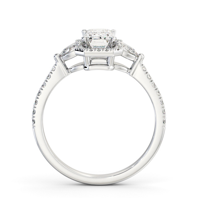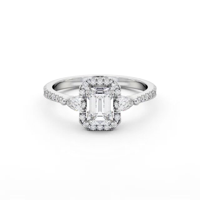 Amira diamond engagement ring with a halo Platinum setting. Truly charming, this ring oozes eternal shine with an emerald shaped centre diamond, a halo of small round diamonds, two pear shaped side diamonds, and a row of additional round diamonds on each side of the band. Smaller diamonds will be of VS1 Clarity and F Colour as standard. This ring is available in a range of metal options and your choice of natural or lab grown diamonds. We offer a free design service for any customised changes that you may require.