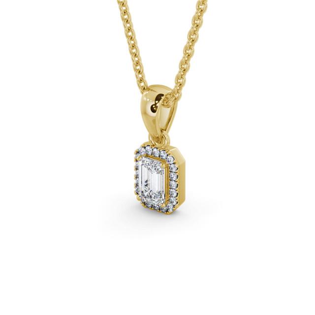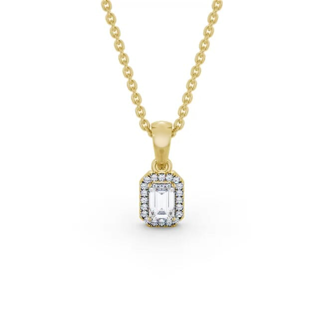 Kristell halo diamond pendant in 18K Yellow Gold. This glamourous pendant features an emerald shaped centre diamond complemented by a frame of sparkling round diamonds. Smaller round diamonds will be of standard quality VS1 Clarity and F Colour. This pendant is available in a range of metal and chain options with your choice of natural or lab grown diamonds. We offer a free design service for any customised changes that you may require.