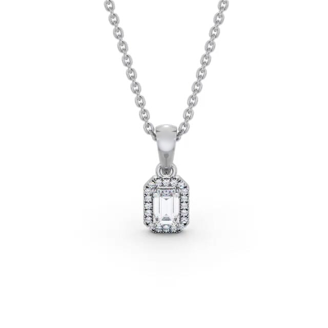 Kristell halo diamond pendant in 9K White Gold. This glamourous pendant features an emerald shaped centre diamond complemented by a frame of sparkling round diamonds. Smaller round diamonds will be of standard quality VS1 Clarity and F Colour. This pendant is available in a range of metal and chain options with your choice of natural or lab grown diamonds. We offer a free design service for any customised changes that you may require.