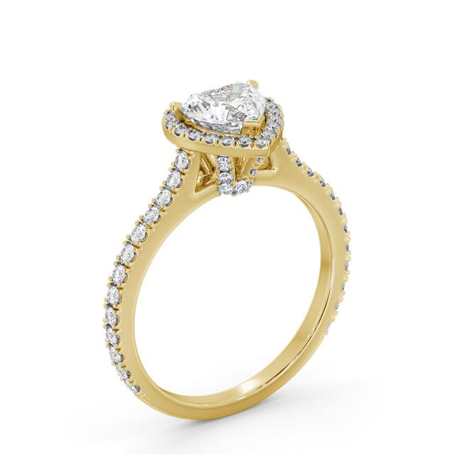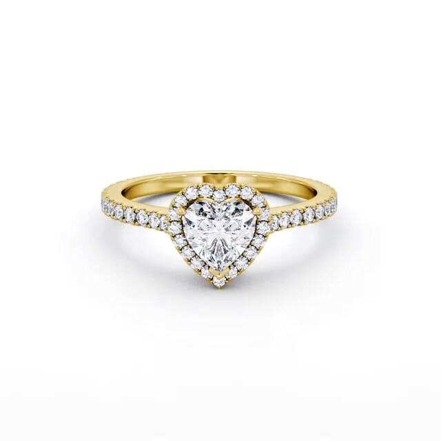 Haddie diamond engagement ring with a halo 18K Yellow Gold setting. Beauty to behold, a single heart shaped centre diamond, small round diamonds around the centre and extra small round diamonds on the rail and shoulders completes this majestic ring. Smaller diamonds will be of VS1 Clarity and F Colour as standard. This ring is available in a range of metal options and your choice of natural or lab grown diamonds. We offer a free design service for any customised changes that you may require.