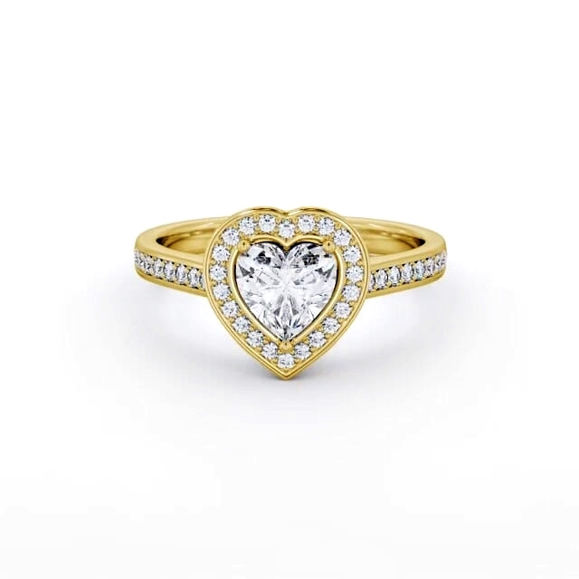 Raya diamond engagement ring with a halo 18K Yellow Gold setting. Sweet and subtle, this engagement ring displays a single heart shaped centre diamond wrapped in a halo frame of sparkling small round diamonds that travel down each side of the shoulder. Smaller diamonds will be of VS1 Clarity and F Colour as standard. This ring is available in a range of metal options and your choice of natural or lab grown diamonds. We offer a free design service for any customised changes that you may require.