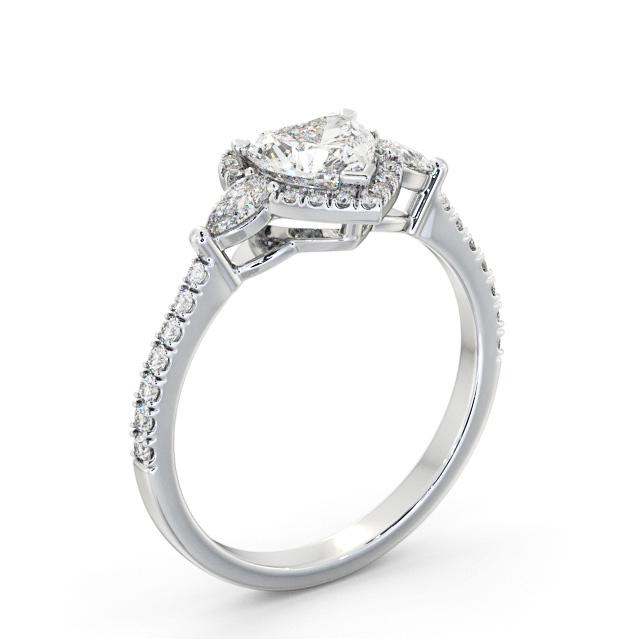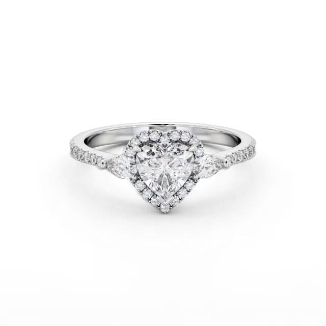 Stefania diamond engagement ring with a halo Platinum setting. Evoking eternal romance, this engagement ring passionately holds a heart shaped centre diamond inside a halo of round diamonds, while two pear shaped side diamonds and additional small round diamonds accent the polished band. Smaller diamonds will be of VS1 Clarity and F Colour as standard. This ring is available in a range of metal options and your choice of natural or lab grown diamonds. We offer a free design service for any customised changes that you may require.