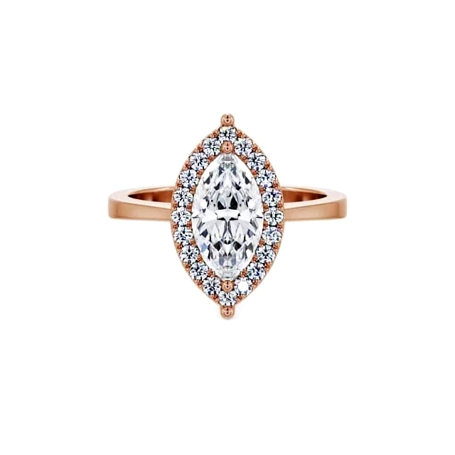 Brenna diamond engagement ring with a halo 18K Rose Gold setting. Unique and versatile, this ring displays a marquise shaped centre diamond crowned with a small round diamond embedded halo. Smaller diamonds will be of VS1 Clarity and F Colour as standard. This ring is available in a range of metal options and your choice of natural or lab grown diamonds. We offer a free design service for any customised changes that you may require.