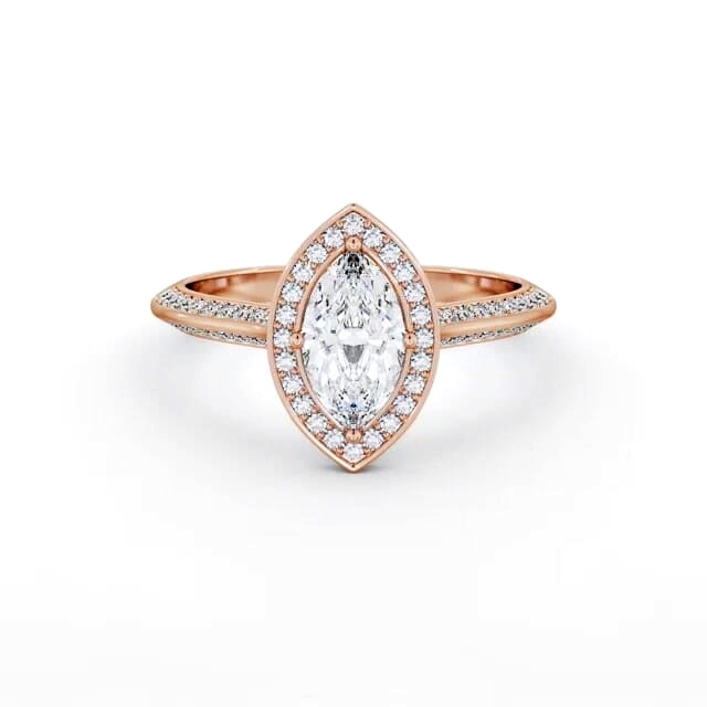 Damaris diamond engagement ring with a halo 18K Rose Gold setting. Truly amazing, a shimmering marquise shaped diamond at the centre is framed by smaller round diamonds and an array of small round diamonds on either side of the knife edge band completes this alluring ring. Smaller diamonds will be of VS1 Clarity and F Colour as standard. This ring is available in a range of metal options and your choice of natural or lab grown diamonds. We offer a free design service for any customised changes that you may require.
