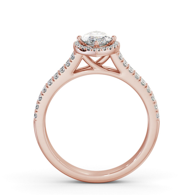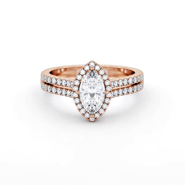 Ellery diamond engagement ring with a halo 18K Rose Gold setting. Beautiful and elegantly adorable, this halo engagement ring features a delicate marquise shaped centre diamond surrounded with luminous small round diamonds that travel down the split band making a splendid design. Smaller diamonds will be of VS1 Clarity and F Colour as standard. This ring is available in a range of metal options and your choice of natural or lab grown diamonds. We offer a free design service for any customised changes that you may require.