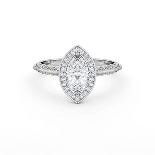 Damaris diamond engagement ring with a halo 18K White Gold setting. Truly amazing, a shimmering marquise shaped diamond at the centre is framed by smaller round diamonds and an array of small round diamonds on either side of the knife edge band completes this alluring ring. Smaller diamonds will be of VS1 Clarity and F Colour as standard. This ring is available in a range of metal options and your choice of natural or lab grown diamonds. We offer a free design service for any customised changes that you may require.