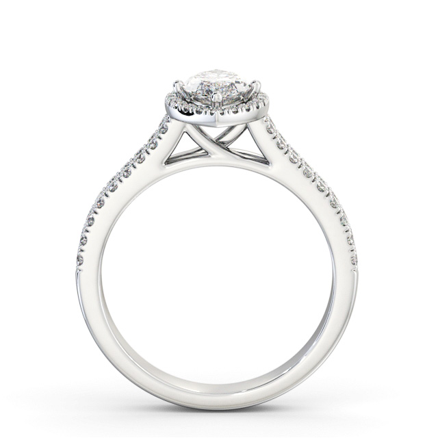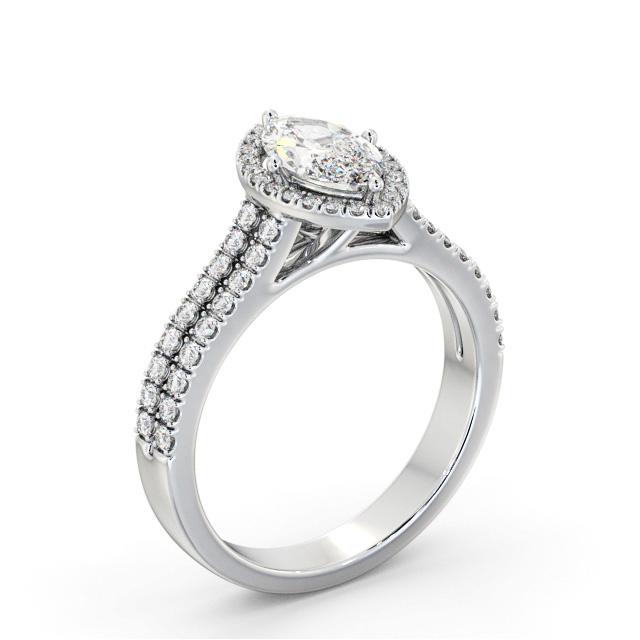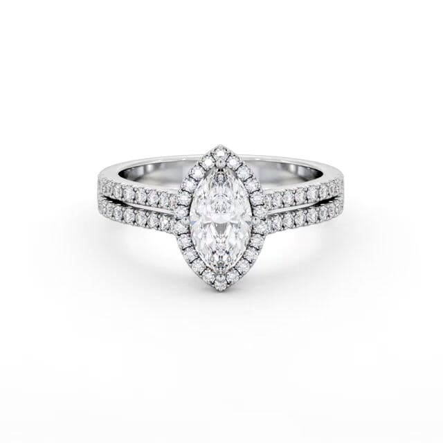 Ellery diamond engagement ring with a halo 18K White Gold setting. Beautiful and elegantly adorable, this halo engagement ring features a delicate marquise shaped centre diamond surrounded with luminous small round diamonds that travel down the split band making a splendid design. Smaller diamonds will be of VS1 Clarity and F Colour as standard. This ring is available in a range of metal options and your choice of natural or lab grown diamonds. We offer a free design service for any customised changes that you may require.