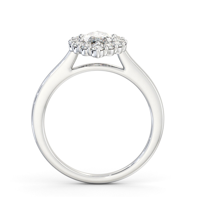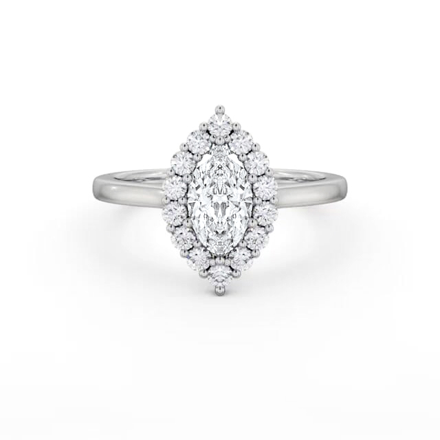Sarene diamond engagement ring with a halo 18K White Gold setting. A marquise shaped centre diamond is passionately embraced by a gleaming array of small round diamonds in this highly polished engagement ring. Smaller diamonds will be of VS1 Clarity and F Colour as standard. This ring is available in a range of metal options and your choice of natural or lab grown diamonds. We offer a free design service for any customised changes that you may require.
